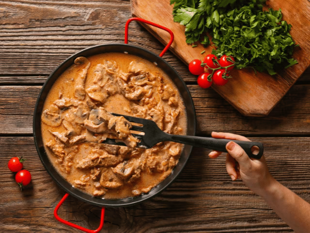 The dish is named after one of the members of the Stroganov family, a Russian noble family. It has been debated whether it is named after the diplomat Pavel Stroganov or the politician Alexander Stroganov. According to legend, while stationed in Siberia, Pavel Stroganov’s chef found the beef to be frozen so solid that it could only be cut into small strips