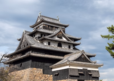 The route continues toward Matsue Castle, rising over the historic core of the former Izumo domain. Completed in 1611, this stately fortress is one of only a few original wooden castles still standing in Japan. Its imposing black lacquered exterior, often referred to as “the Black Castle,” encloses a multistory keep designed for both defense and governance. Inside, heavy timber beams, displays of armor, and artifacts connected to the Horio and Matsudaira clans offer a compelling window into the political and cultural life of the early Edo period. From the top level, sweeping views extend across the castle moats, toward Lake Shinji and the beautifully preserved townscape below.